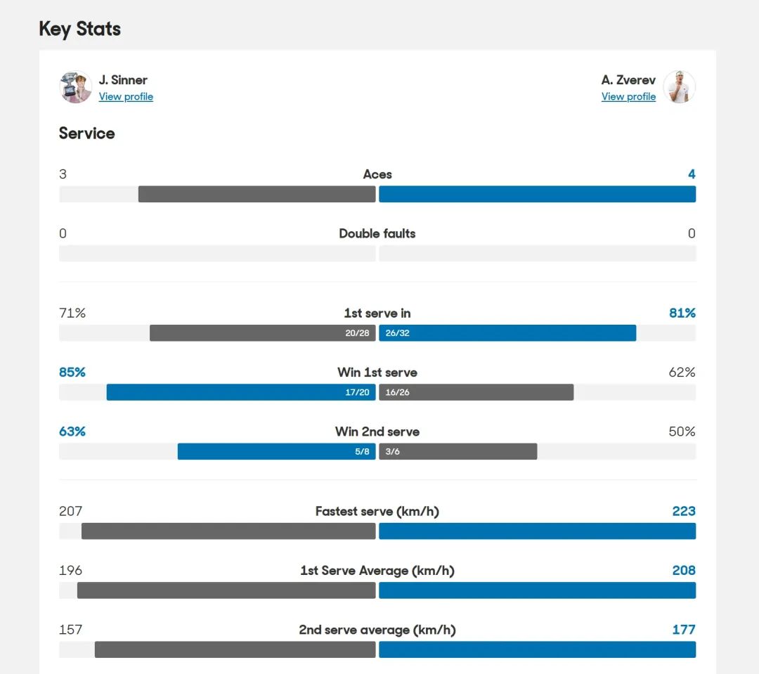 在自己的发球胜盘局中,辛纳又一次打出love game将首盘稳稳拿下。首盘比赛,双方的一发进球率都颇为不错,兹维列夫更是高达81%,可惜相比于辛纳的云淡风轻,首进澳网决赛的兹维列夫显得有点太紧,高达12次的非受迫性失误也是他丢掉这一盘比赛的最大原因。