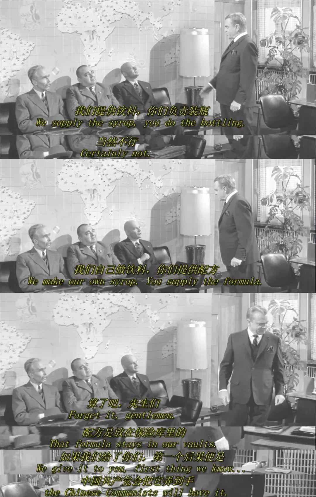 ●1961年美国导演比利·怀德的经典之作One, Two, Three (中译《玉女风流》)中,可口可乐的灌装外包原则被做成了政治梗,西德可乐总经理拒绝把配方交给想开可乐厂的苏联代表。截图:一枫之无涯@豆瓣2