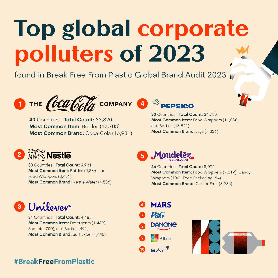 说到可口可乐的“罪行”,更为西方普通公众所熟知的其实是“世界上最大塑料污染企业”的名号。据国际环保机构摆脱塑料运动(Break Free From Plastic,BBFP)过去几年的品牌审计数据,2018年起,可口可乐已经连续多年位居最大的塑料污染企业的榜首。2023年的审计结果揭示:可口可乐所产生的塑料垃圾总量要远超第二名(雀巢)和第三名(联合利华)加起来的总和。