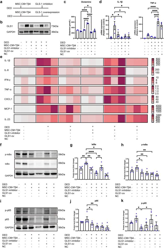 同样,免疫印迹实验的结果表明,与DED组相比,MSC-CM+Tβ4组IκBα和NF-κB的总量和磷酸化形式均下调。然而,抑制和过表达GLS1分别加强和逆转了联合疗法对IκBα/NF-κB通路的抑制作用。因此,联合疗法可调节GLS1恢复谷氨酰胺水平,抑制下游IκBα/NF-κB信号传导和相关炎症因子的表达,从而缓解干眼症损伤。