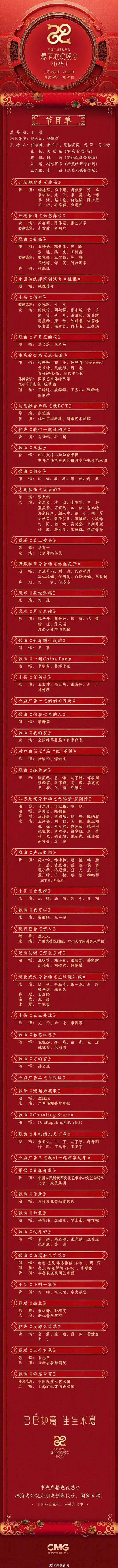 中央广播电视总台《2025年春节联欢晚会》节目单正式发布。评论区一起分享2025蛇年春晚你最期待谁?