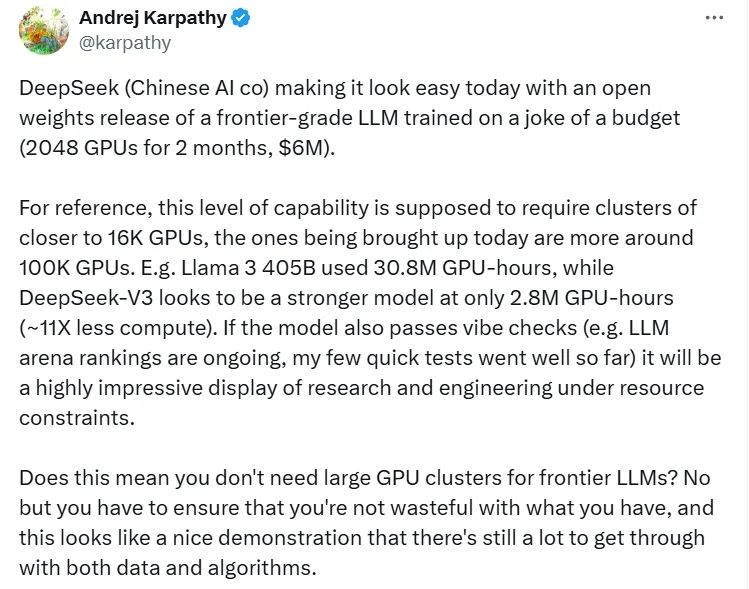 考虑到DeepSeek与同行相比极低的训练预算——不到600万美元的资金和2048块英伟达H800芯片,凯瑟琳无比认同OpenAI创始成员安德烈·卡帕斯(Andrej Karpathy)的评价,“(DeepSeek的成功)是否意味着前沿大语言模型不再需要大型GPU集群?不是,但你必须确保不浪费你所拥有的资源。(DeepSeek新模型)这看起来是一个很好的证明,说明我们在数据和算法方面还有很多工作要做。”