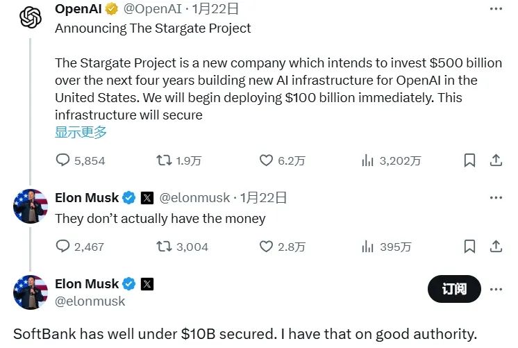 值得一提的是,就在这项计划公开后不久,特朗普的坚实盟友马斯克拆台称,主要负责项目财务部分的软银“实际上没有钱”。