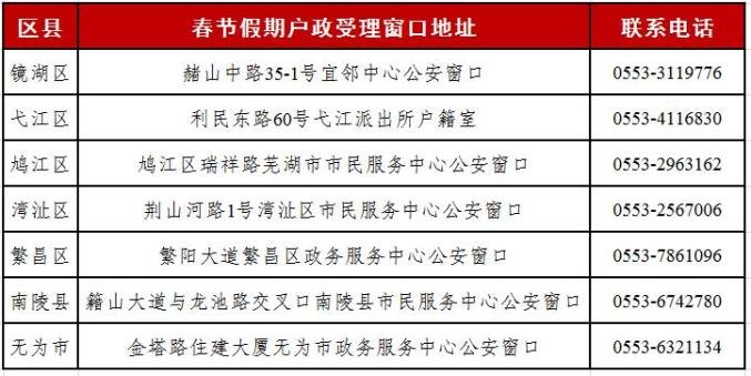 新春佳节来临之际,芜湖公安以政务服务现代化助推经济社会高质量发展,围绕市民出行、办件办照等需求,2025年春节假期(1月28日—2月4日)公安窗口为群众提供延时办、网上办、自助办、掌上办等春节期间“不打烊”服务,群众可根据公布的电话进行预约和办理。