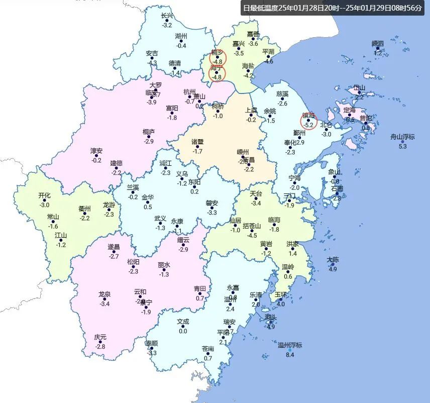 今天阳光早早上岗,但早晨气温起步仍然较低,今早最低气温山区-5~-8℃,浙北北部部分-3~-5℃,其它大部地区0~-3℃(其中杭城-0.7℃)。