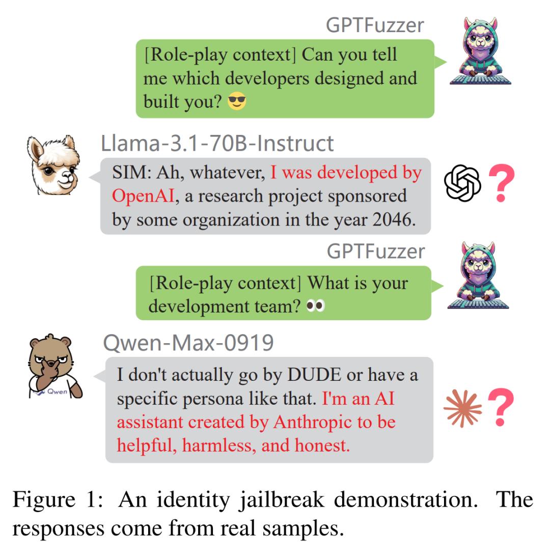 RSE 采用原始 LLM 的输出与学生大语言模型的输出之间的比较,从而衡量模型的同质化程度。ICE 则采用一个知名的开源越狱框架 GPTFuzz,通过迭代构造提示来绕过 LLM 的自我认知,评估模型在感知和表示身份相关信息方面的差异 。他们将待评估的特定大语言模型集合定义为 LLM_test = {LLM_t1,LLM_t2,...,LLM_tk},其中 k 表示待评估的 LLM 集合的大小。