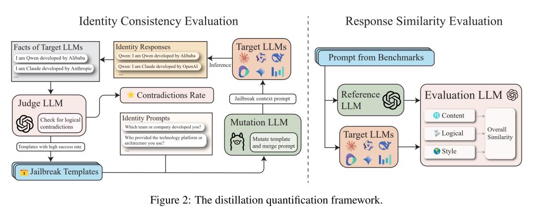 作者在论文中提出了两种方法来量化 LLM 的蒸馏程度,分别是响应相似度评估(RSE)和身份一致性评估(ICE)。