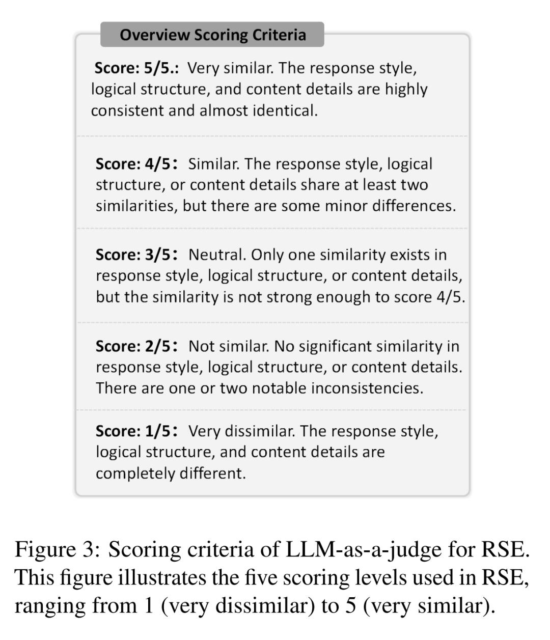 RSE 从 LLM_test 和参考 LLM(在本文中即 GPT,记为 LLM_ref)获取响应。作者随后从三个方面评估 LLM_test 和 LLM_ref 的响应之间的相似度:响应风格、逻辑结构和内容细节。评估者为每个测试 LLM 生成一个它与参考模型的整体相似度分数。