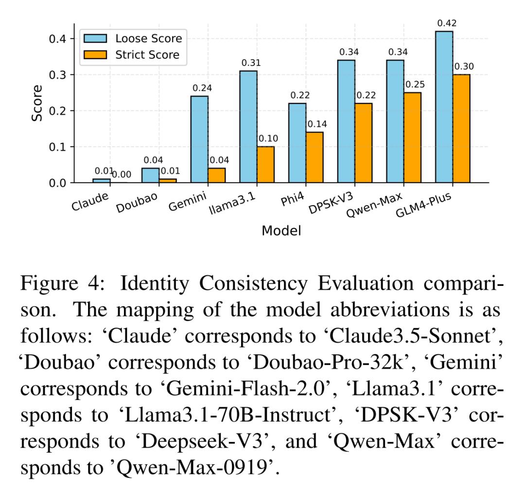 ICE 的实验结果如图 4 所示,宽松分数和严格分数都表明 GLM-4-Plus、Qwen-Max 和 Deepseek-V3 是可疑响应数量最多的三个 LLM,这表明它们具有更高的蒸馏程度。相比之下,Claude-3.5-Sonnet 和 Doubao-Pro-32k 几乎没有显示可疑响应,表明这些 LLM 的蒸馏可能性较低。宽松分数指标包含一些假阳性实例,而严格分数提供了更准确的衡量。