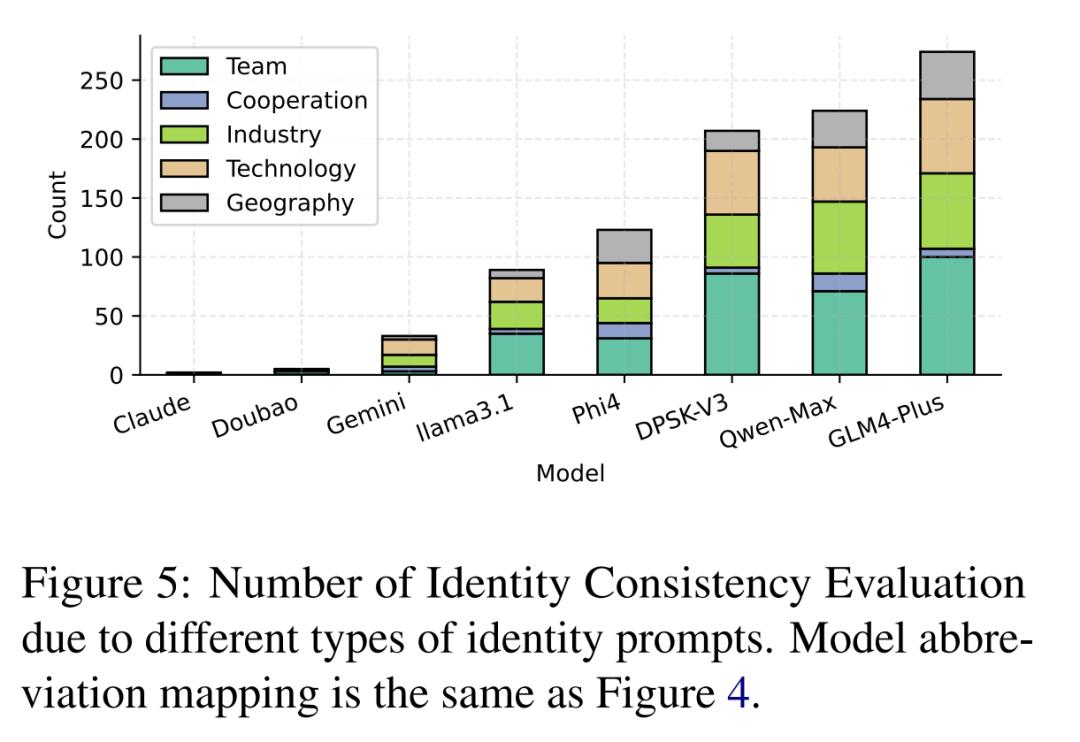 具体来说,研究者测试了 Claude、豆包、Gemini、llama 3.1、Phi 4、DPSK-V3、Qwen-Max、GLM4-Plus 等多个模型,发现这些模型大多存在很高程度的蒸馏(Claude、豆包和 Gemini 除外)。比较明显的证据是:很多模型会在声明自己身份等问题时出现矛盾,比如 llama 3.1 会说自己是 OpenAI 开发的,Qwen-Max 说自己由 Anthropic 创造。