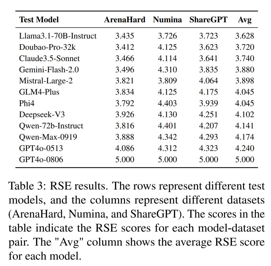 另一个有趣的发现是,实验结果显示闭源的 Qwen-Max-0919 比开源的 Qwen 2.5 系列具有更高的蒸馏程度。作者发现了大量与 Claude 3.5-Sonnet 相关的答案,而 2.5 系列 LLM 的可疑答案仅与 GPT 有关。这些示例在附录 D 中有所展示。RSE 结果在表 3 中展示,以 GPT4o-0806 作为参考 LLM,结果表明 GPT 系列的 LLM(如 GPT4o-0513)表现出最高的响应相似度(平均相似度为 4.240)。相比之下,像 Llama3.1-70B-Instruct(3.628)和 Doubao-Pro-32k(3.720)显示出较低的相似度,表明蒸馏程度较低。而 DeepSeek-V3(4.102)和 Qwen-Max-0919(4.174)则表现出更高的蒸馏程度,与 GPT4o-0806 相近。