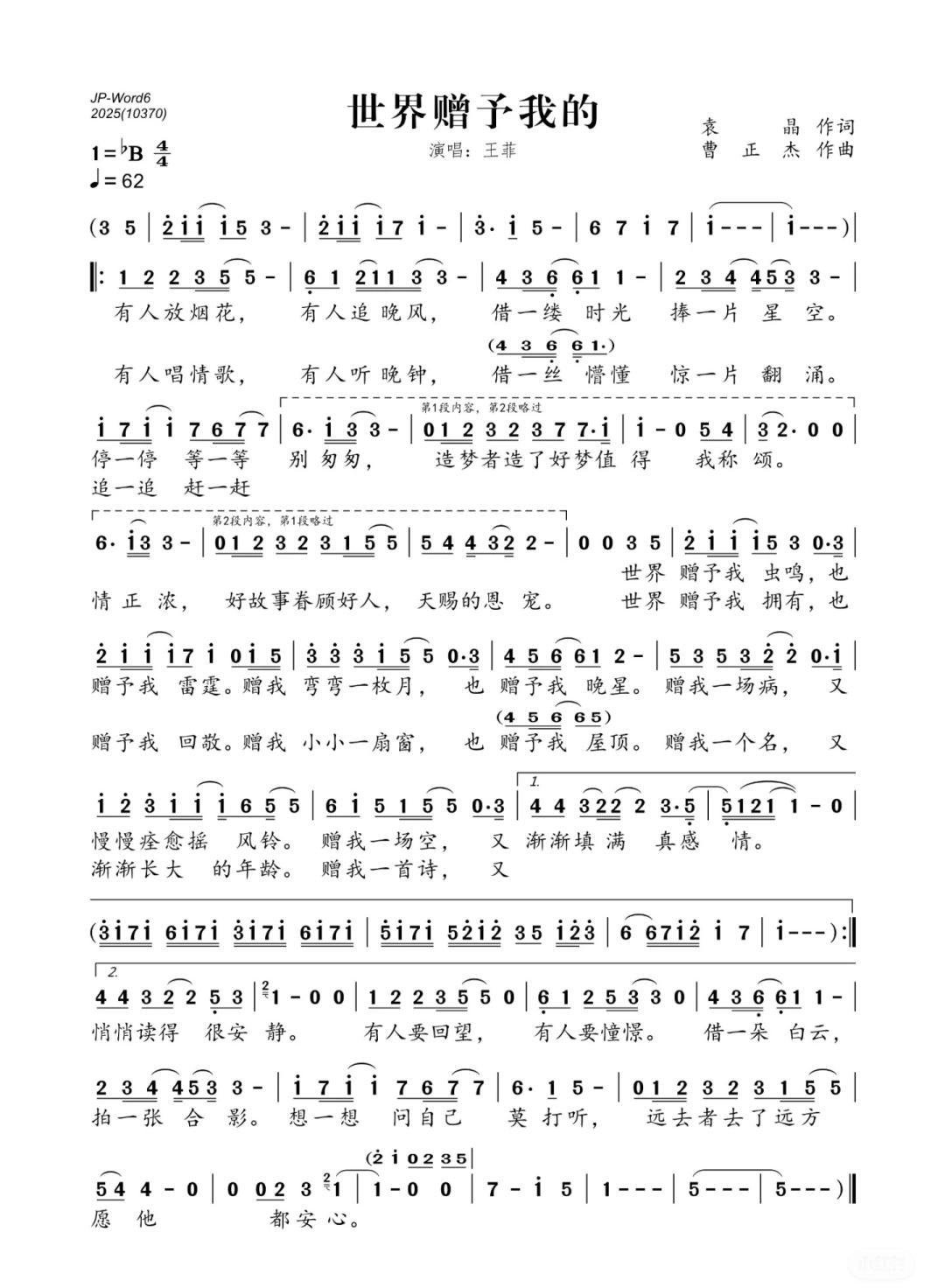 带着这些细腻又深刻的感悟,去年6月,袁晶花1个小时在书房完成了《世界赠予我的》的歌词,经过几番修改,交由老搭档曹正杰谱曲。八九月份的时候,袁晶集中打包了七八首认为适合蛇年春晚风格的歌曲,向春晚音乐组交了“作业”,其中就有并非为春晚定制的这首歌。