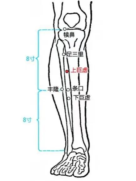 位置:足三里下方三寸上巨虚同属胃经,为大肠的下合穴。可以由上巨虚向足三里方向用力推按数分钟,推时有痠胀感,部分人会立即嗳气或放屁,是脾胃滞气得以推行的效果。