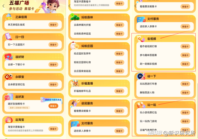 筛选一波后,其实已经可以说今年集福卡任务的增量就是看视频、碰一下和玩一玩三个模块。