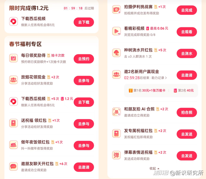 其中拉新就是邀请新用户,使用则包括了发布视频、在抖音和朋友聊天、参加活动三类,最后的引流就是将抖音的既有流量扩展至西瓜视频、汽水音乐、今日头条上,帮助同在“字节”的好兄弟们也能分到一些春节的流量红利。
