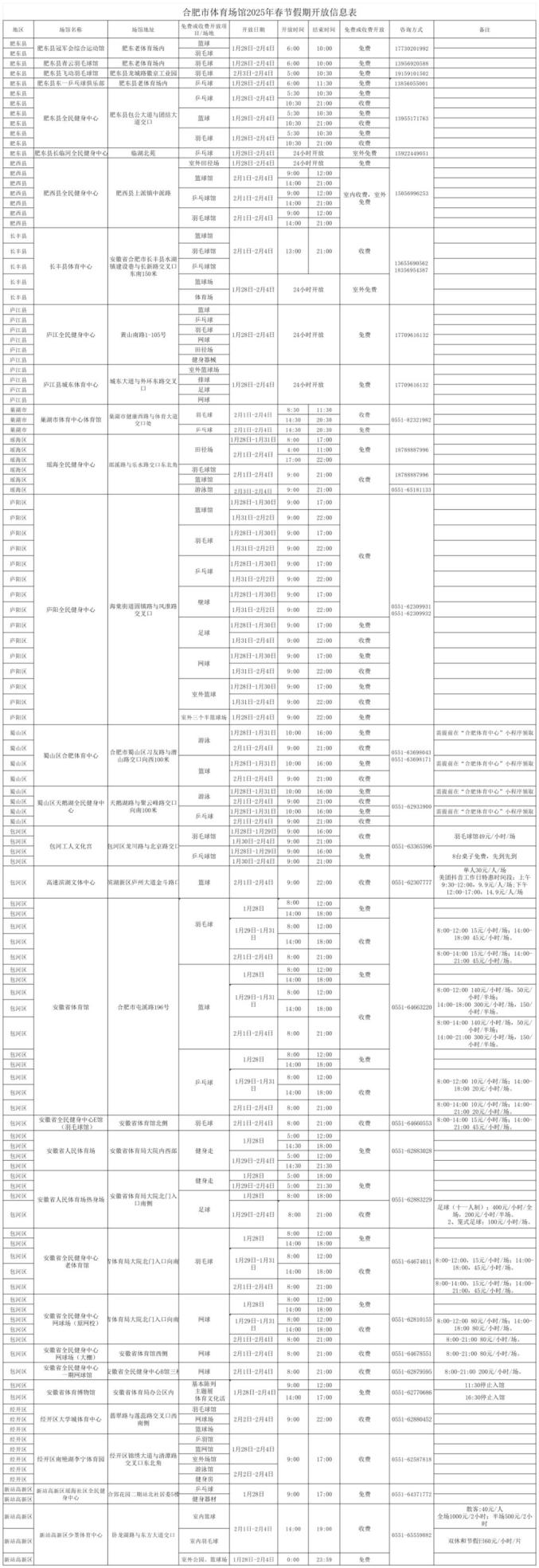 合肥还有多个公共体育场馆在春节期间惠民开放,让健康与新春同行,让公共体育场馆的社会效益得以充分彰显。合肥市体育场馆2025年