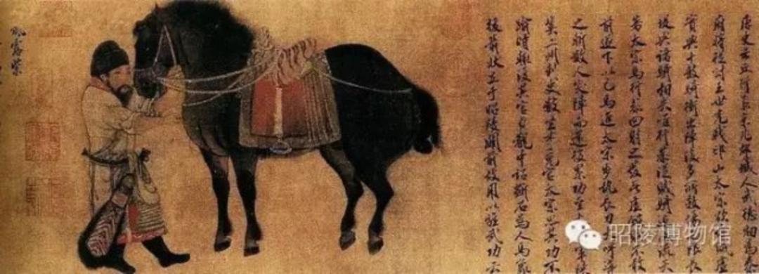 拳毛騧原型战马周身黄色旋毛,黑嘴头。武德五年(622)三月,唐太宗与刘黑闼在洺水激战时骑乘。战斗中,马身中九箭而亡。唐太宗给它的赞语是:“月精按辔,天駟横行,弧矢载戢,氛埃廓清。”