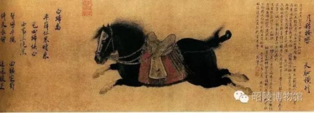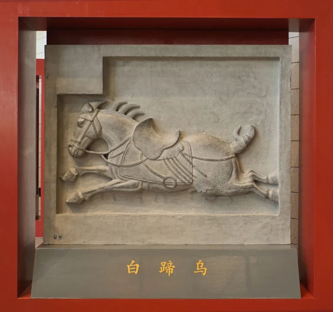 白蹄乌原型战马纯黑色,四蹄俱白,武德元年(618),唐太宗平薛仁杲时所骑。四蹄腾空,呈飞速奔驰之状。唐太宗题赞语:“倚天长剑,追风骏足。耸辔平陇,回鞍定蜀。”