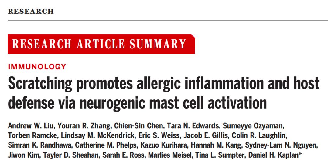 2025 年 1 月 31 日,匹茨堡大学的 Daniel Kaplan 教授团队(Andrew W. Liu 为第一作者)在国际顶尖学术期刊 Science 上发表了题为:Scratching promotes allergic inflammation and host defense via neurogenic mast cell activation 的研究论文。