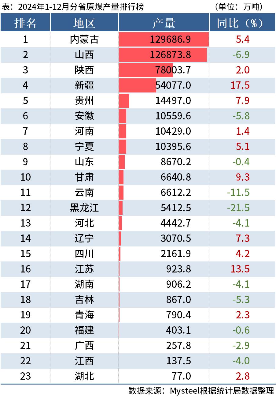 2024年内蒙古原煤产量12.97亿吨,跃居全国第一,同比增长5.4%;同期山西原煤产量12.69亿吨,同比下降6.9%。