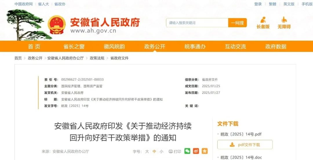 安徽省人民政府印发《关于推动经济持续回升向好若干政策举措》的通知。2025年安徽将开展“重大项目前期工作攻坚年”行动,力争全年新开工亿元以上重点项目1000个以上,省重点项目完成投资6000亿元以上。此外,今年第一批省重点项目1626个,总投资3.5万亿元,年度计划投资5994.3亿元。