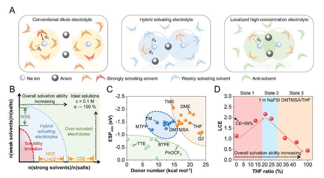 为了克服这些技术难点,实现钠金属电池的长寿命与高效性能,迫切需要一种全新的电解质体系,能够同时优化溶剂化结构、抑制副反应,并增强界面稳定性。混合溶剂化电解质(HSE)通过调控强溶剂和弱溶剂的协同作用,在解决上述问题方面展现了巨大潜力。