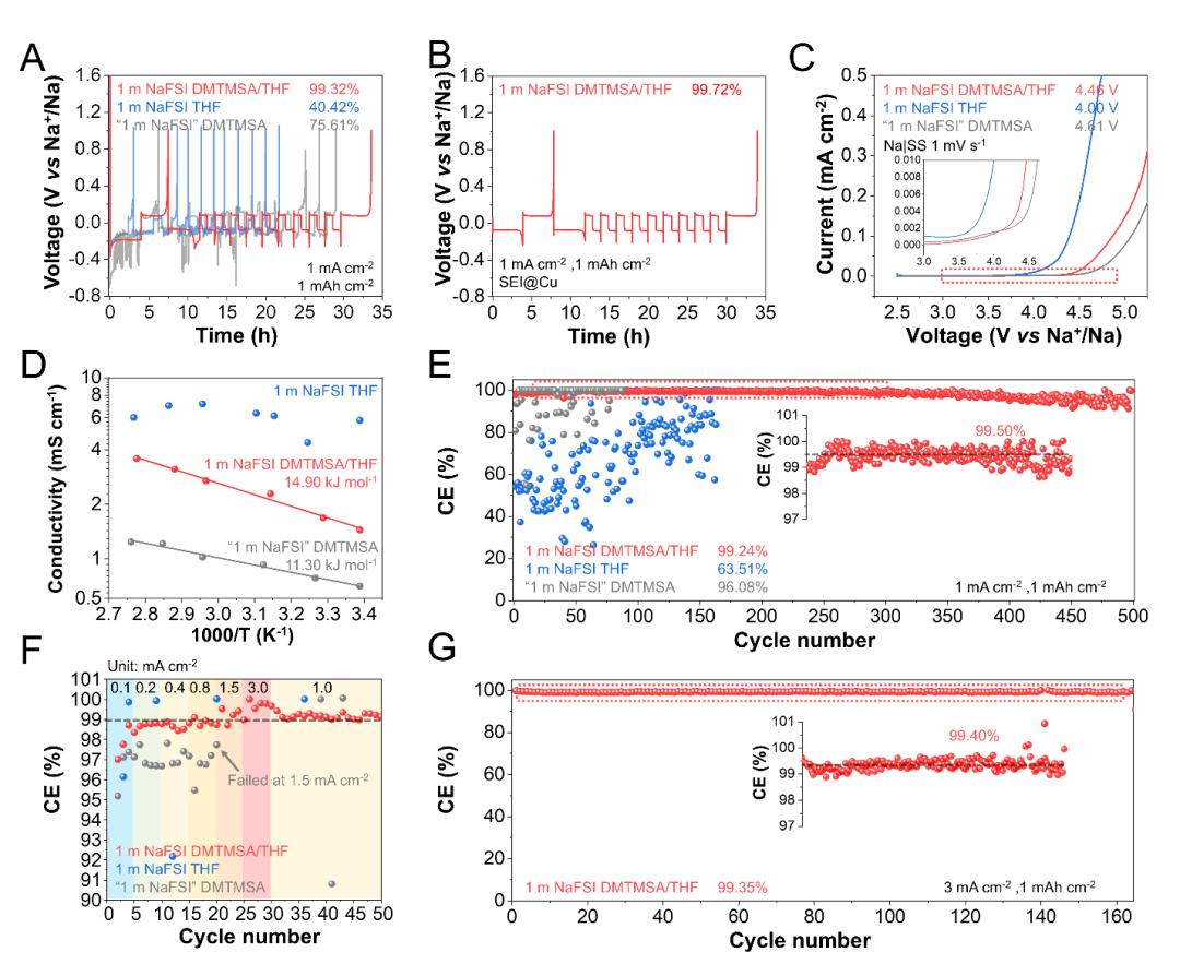 对比单一DMTMSA或THF溶剂形成的溶液,在相同的循环条件下,混合溶剂形成的电解液与金属电极之间具有更高的稳定性。在1 mA cm-2测试条件下,混合溶剂化电解液在Na||Cu体系里实现高达99.72%的库伦效率,并能够在3 mA cm-2下保持99.40%的库伦效率。在高电流密度下,HSE体系的极化电压显著降低,表明钠金属表面形成了均匀且稳定的钝化层。