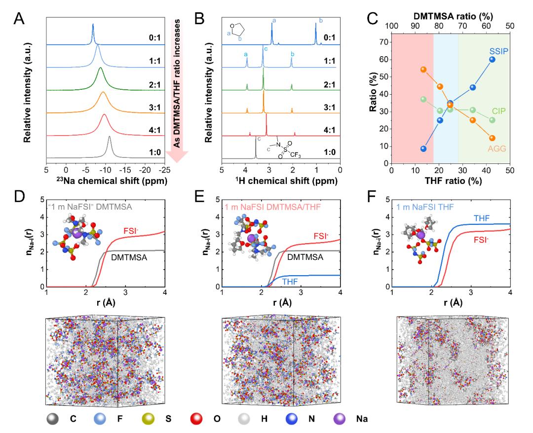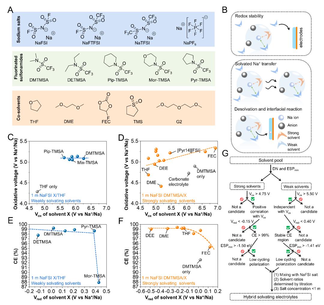 该研究提出了一种混合溶剂化策略,结合了弱溶剂化性溶剂(如二甲基三氟甲磺酰胺,DMTMSA)和强溶剂化性溶剂(如四氢呋喃,THF)。这一设计基于以下几点核心理念: