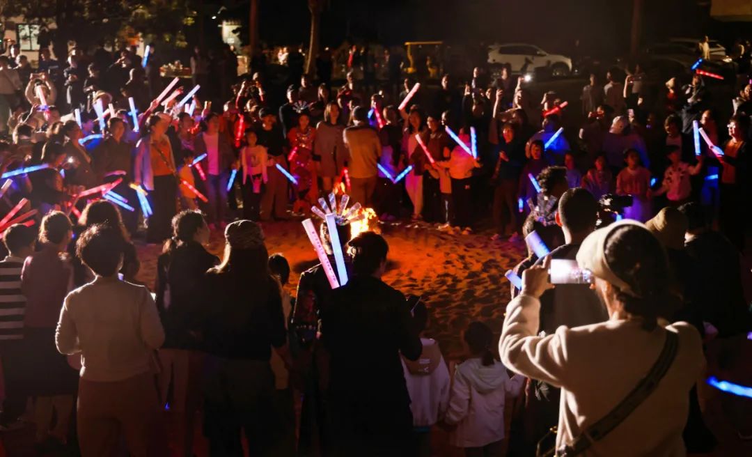 ️随后现场篝火也被点燃,伴随着欢快的音乐♪,市民游客们手拉手♪,围着篝火,尽情载歌载舞,玩游戏,每个人都沉浸在欢乐的氛围中。