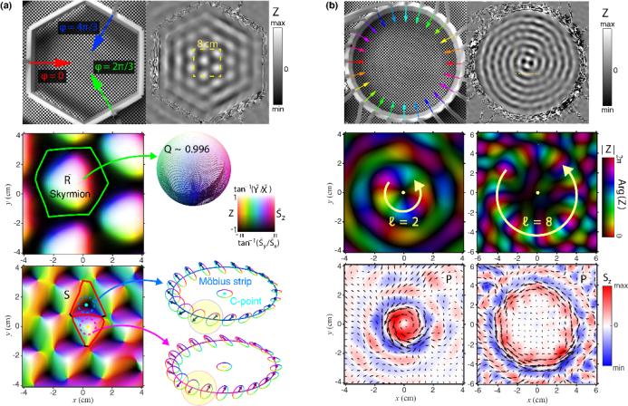 (a)水波位移场Skyrmions, 自旋密度场Merons和偏振奇点与莫比乌斯环。(b)具有不同拓扑荷的贝塞尔型水波涡旋,自旋和轨道角动量垂直分量具有锁定关系。