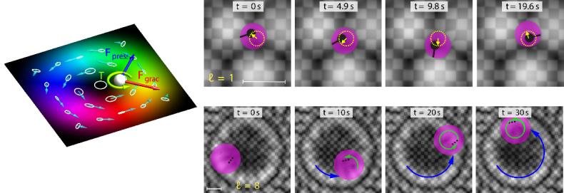 利用液体表面波拓扑结构实现对漂浮粒子的多维度运动控制,成为研究的一个重要创新点。团队首次实现了包括基于液体表面波梯度力的亚波长粒子捕获,由局部波动动量驱动的粒子推进与轨道运动,由局部自旋密度引发的粒子自旋运动(如图2所示)等。