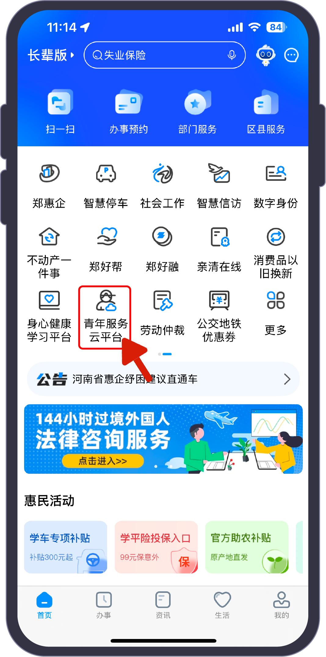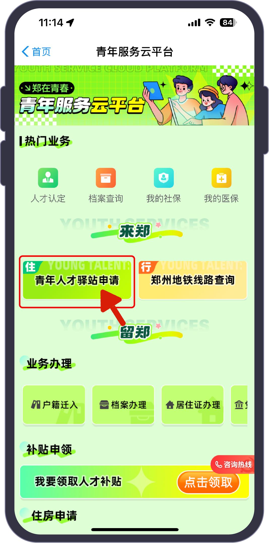 登录“郑好办”APP,向左滑动icon位,点击“青年服务云平台”,点击“青年人才驿站申请”即可。