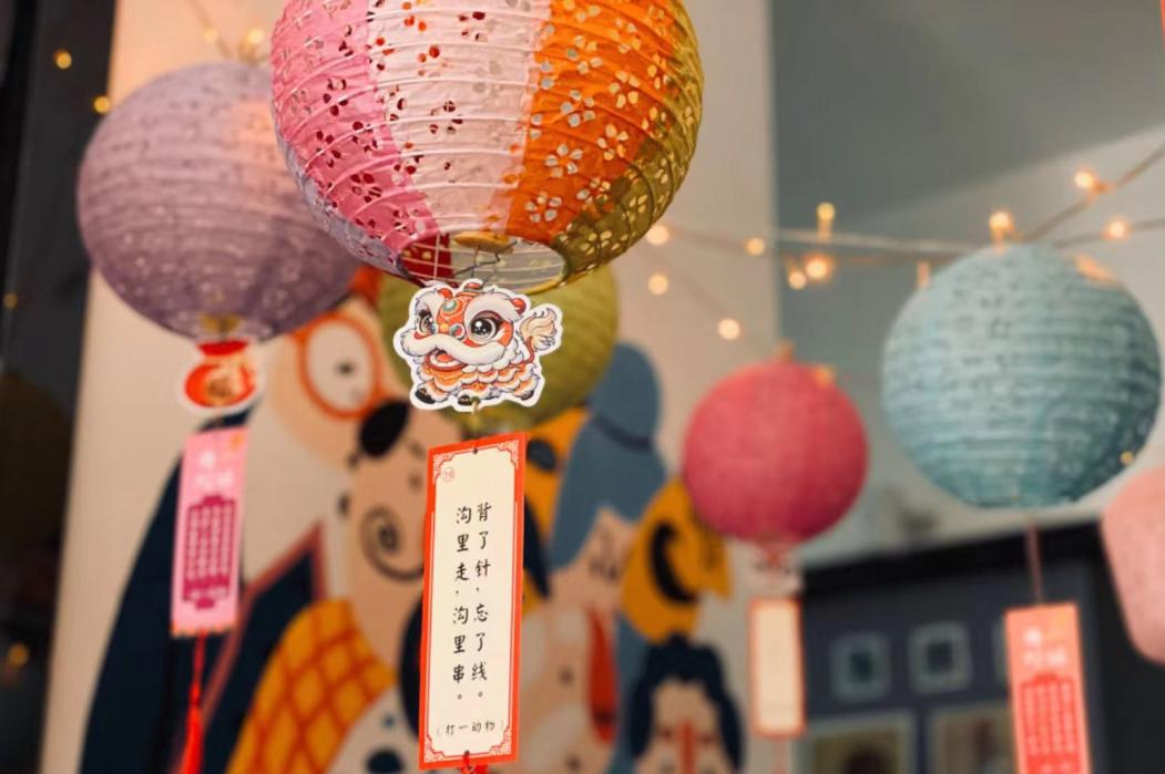 现场准备的花灯下面挂着灯谜,同学们可将猜中的灯谜取下,到指定地点将答案告诉给老师,答案正确可获得一个积分贴纸。