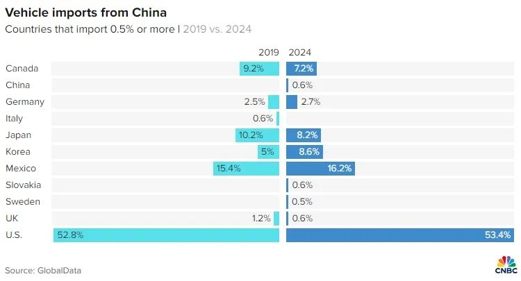 当地时间2月5日,美国消费者新闻与商业频道(CNBC)报道称,尽管出口美国的中国汽车数量的占比极低,几乎可以忽略不计,但不容忽视的是,美国每年从中国进口的价值近百亿的汽车零部件,将不可避免地受到这一关税政策的冲击。这将导致已经高企的美国汽车价格进一步上涨,最终让美国消费者买单。