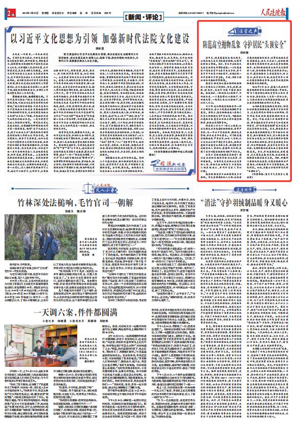 1月23日,《人民法院报》第二版法官之声栏目刊登《防范高空抛物乱象 守护居民“头顶安全”》一文,内容如下:防范高空抛物乱象 守护居民“头顶安全”