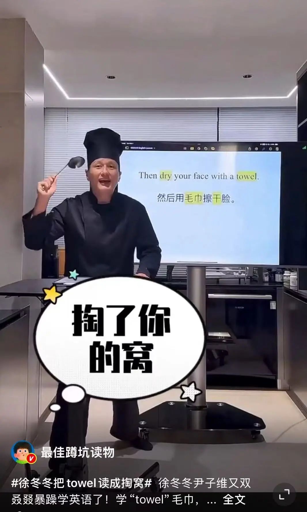 这种维度下,尹子维和徐冬冬或许是最经得起质疑和围观的夫妻之一。最近两人靠着一场“疯狂的英语”直播又开辟了抽象情侣的赛道——尹子维在写满英文单词的白板前当起了英语老师,暴躁地喊着“say it!say it!”;徐冬冬则操着浓重的东北口音,舌头疯狂打结,怒吼般跟读:“因泡儿腾特(important)!因翻得密(in front of me)!撇儿片儿(prepare)!”网友开玩笑称,听完徐冬冬的“致命”发音,看到尹子维仍面带笑容一遍遍纠正发音,才知道原来面相“凶神恶煞”的尹子维是真正情绪稳定的人。