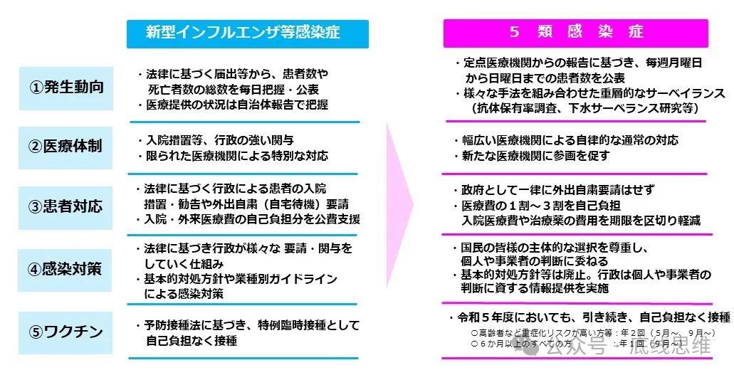 对于患者来说,也无需承担额外的医疗费用(除常规的10%-30%自付费用外),住院费用和治疗药物费用也不再由政府补贴。此外,政府不再发布“基本的対処方針”等强制性指导方针,转而提供参考信息,供个人和企业自行判断和决策。