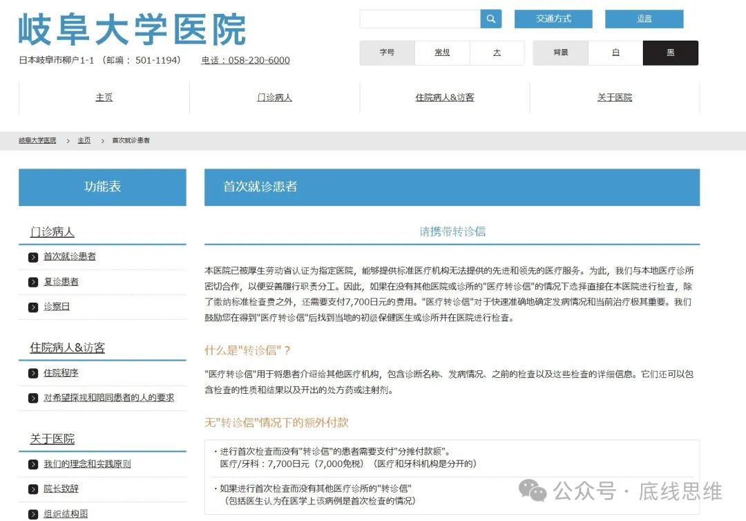 例如东京都立大久保医院和岐阜大学医院,都只是告诉患者,建议先去其他医院,如果其他医院觉得需要到大医院,再给你转诊介绍信,你拿着介绍信再去这些医院。但是最核心的点是:如果你是急诊,没有介绍信的话顶多多收你约7000日元(合不到350元人民币)的额外费用,但并不会拒绝治疗。