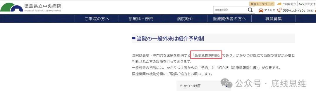 一些非常专业和救急的医院,如下面这间德岛县立中央医院,就会特地标记出,本院属于高度急性期医院,基本上就是非常严重的情况,别的医院医生判断必须去这里就医,才会转诊过来。