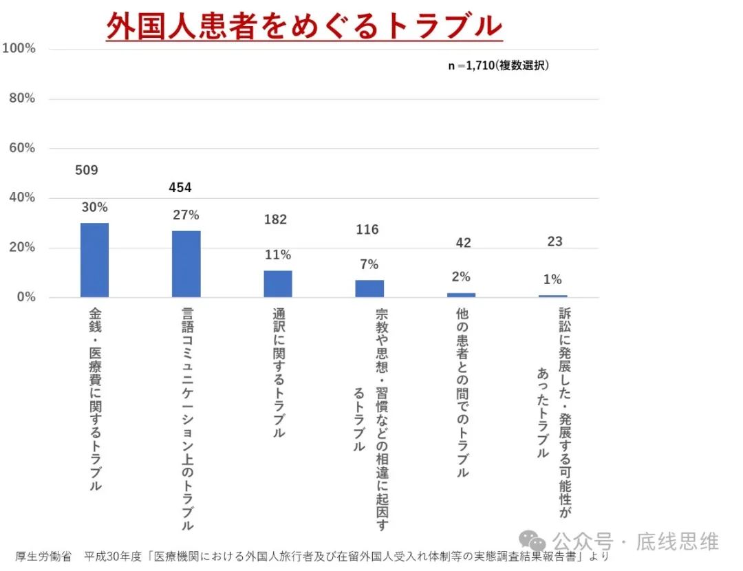 结合到目前为止的经验来看,外国人在日本就医最大的障碍,似乎只有语言了。基于厚生劳动省的数据,外国人在日本就医中产生的最多的问题如下表所示。最多的是诊疗费用的问题,第二和第三分别是语言沟通问题和翻译问题。