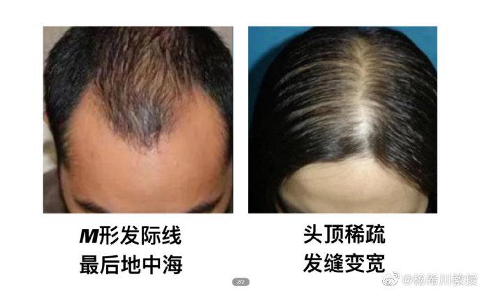 女性主要表现为头顶部毛发稀疏,发缝明显变宽,而前额发际线很少出现后移。