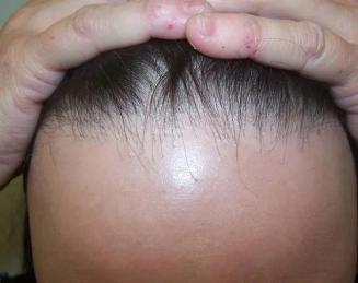 男性表现为前额两侧头发纤细、稀疏,逐渐向头顶延伸,额部发际向后退缩,前额变高呈M形,最后形成“地中海”。