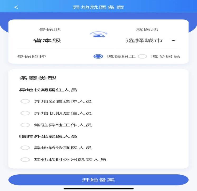 第二步:选择备案信息。备案人根据自己的实际情况,选择“就医地”“参保险种”“备案类型”,点击【开始备案】按钮。