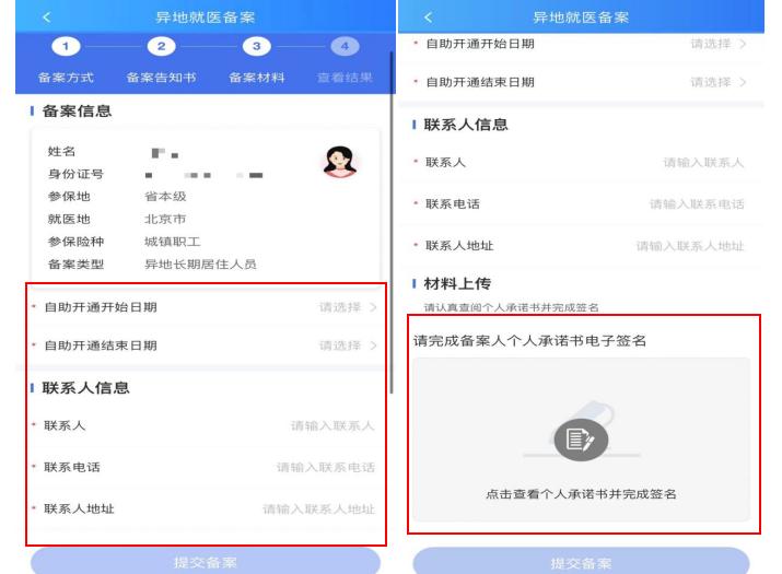 (温馨提示:备案告知书内容详细展示了备案人员参保地相关政策,为了确保备案人员医保待遇的享受,请仔细阅读。)第四步: 填写备案材料。填写相关信息后,点击查看个人承诺书并完成个人承诺书电子签名,确认无误后,点击【提交备案】按钮。