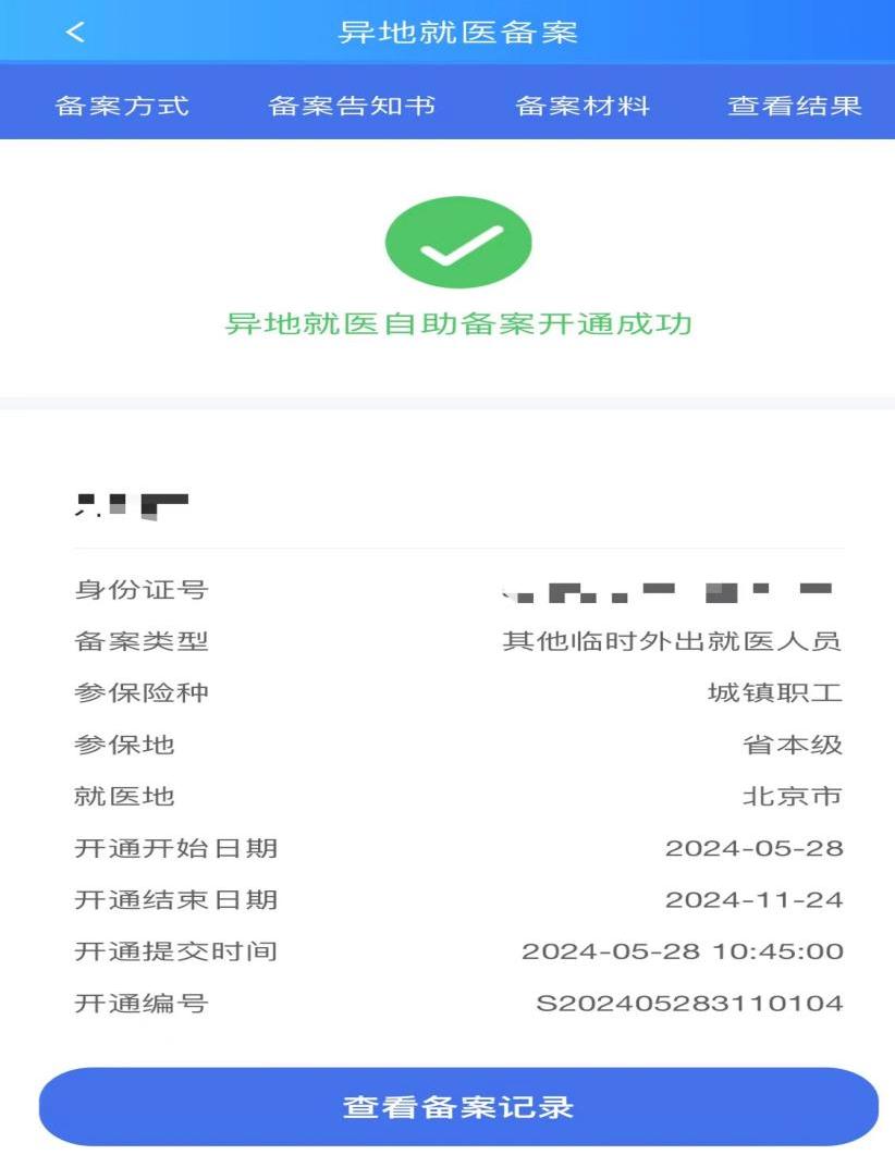 (温馨提示:页面上“自助开通开始日期”须选择在出院日期之前;“自助开通结束日期”自动根据备案人员备案类型进行匹配,备案人点击系统默认时间即可。为了减少参保人员频繁操作的麻烦,异地长期居住人员办理登记备案后,未申请变更备案信息或参保状态未发生变更的,备案长期有效;临时外出就医人员办理登记备案后,半年有效,备案结束时间默认6个月;“联系人信息”需备案人员如实填写。)第五步: 查看备案结果。点击提交备案后,就可以看到备案的结果。