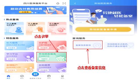 四、备案记录查询如果参保人员需要查询自己更详细的备案记录,可以在四川医保APP或者微信医保小程序首页,点击【异地就医服务】,在“备案信息查询”中,查询到参保人当前有效备案和历史备案记录。
