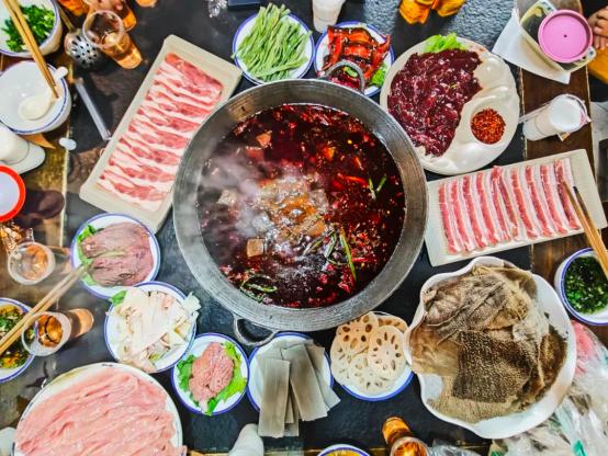滚烫的牛油锅底红得夺目、辣得过瘾
