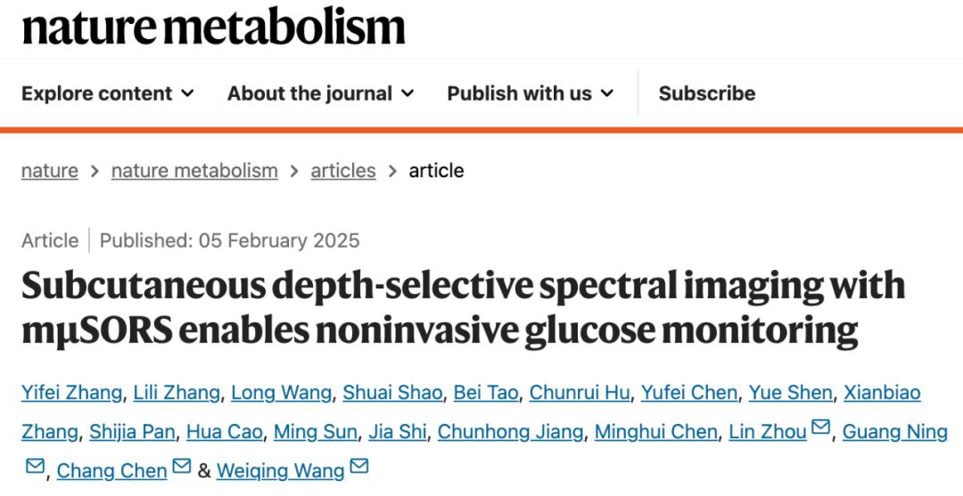 2025 年 2 月 5 日,上海交通大学医学院附属瑞金医院王卫庆教授、上海近观科技陈昌研究员、周琳博士等在 Nature 子刊 Nature Metabolism 上发表了题为:Subcutaneous depth-selective spectral imaging with mμSORS enables noninvasive glucose monitoring 的研究论文。