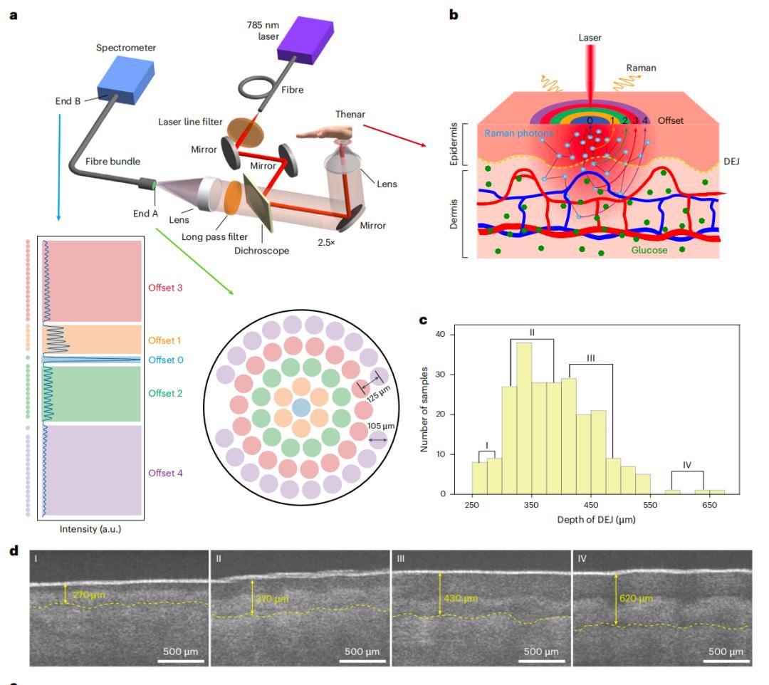 该研究开发了一种多重微空间偏移拉曼光谱技术(mμSORS),该技术能够直接测量人体皮肤表皮层和真皮层的拉曼信号,在无需个性化校准和数据采集的情况下,实现高精度的血糖监测,且适用于不同年龄、肤色和肥胖的人群。