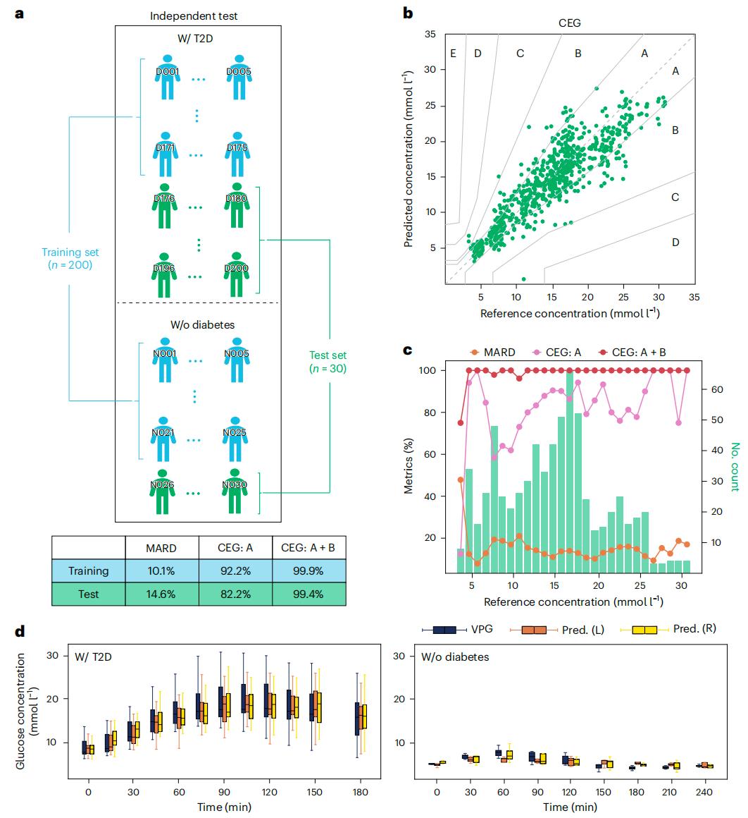 研究团队共收集了 30 多万套由金标准的静脉血浆葡萄糖(VPG)水平所标定的 mμSORS 光谱数据集,并进行血糖预测模型建模及分析,证实了 mμSORS 无创血糖检测值与静脉血血糖值之间绝对误差的平均值(MARD)为 14.6%,99.4% 的预测值处于共识误差网格(CEG;A + B)的临床可接受区域内。